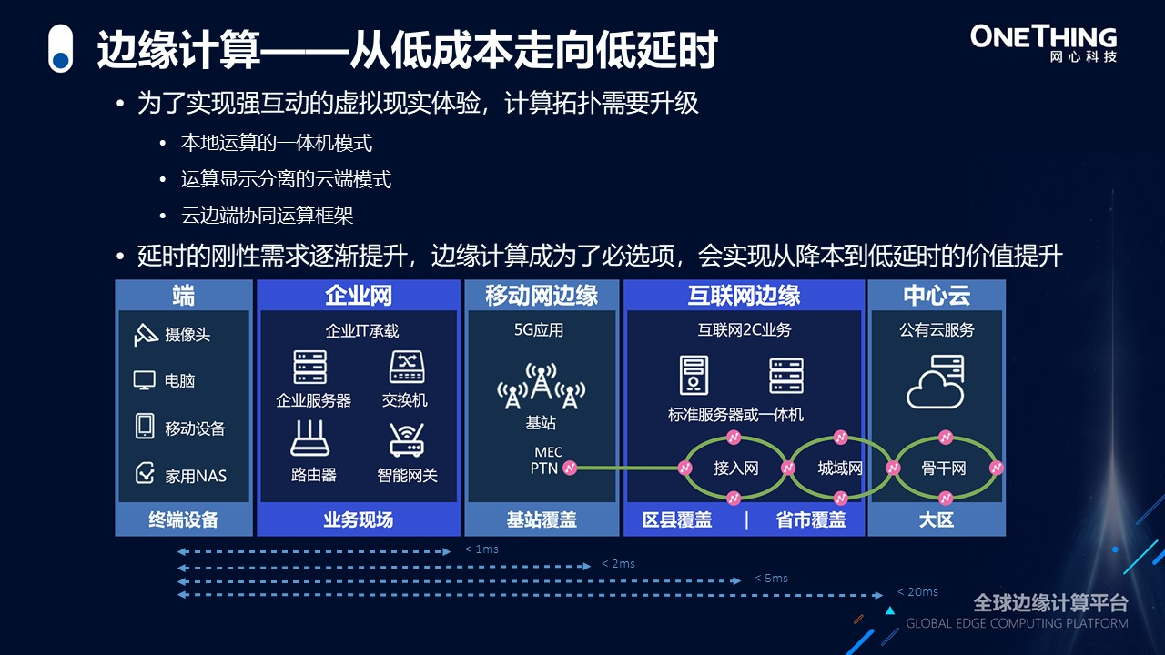 同时整体的计算拓扑也亟待升级,为了达到更好的性价比,必须突破现有网络模型,从最开始支持本地运算的一体机模式,以及运算显示分离的云端模式,升级到云边端协同运算框架,真正将边缘计算融入到整个体系。