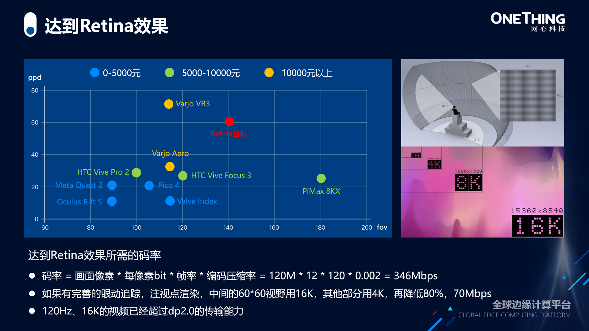 要想达成上述目标,还存在着非常大的挑战。以视觉为例,最少要达到Retina的水平。而要达到Retina效果所需的码率,需要16K的屏幕。做一个简单的计算,如果只在最中间的60*60视野,用Retain效果配合一定的眼动追踪,周边用4K,经过压缩也还需要达到346Mbps的传输速度。值得注意的是,120Hz、16K的视频已经超过DP2.0的传输能力。