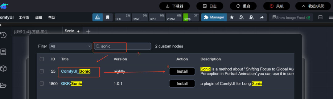 在ComfyUI管理器 → 节点管理 → 搜索Sonic → 下载相关节点 → 下载完成后点击【重启】实例。如下图所示