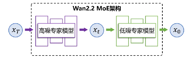 据悉,通义万相 Wan2.2共开源了三个版本。其中,Wan2.2-T2V-A14B(文生视频)、Wan2.2-I2V-A14B(图生视频)由高噪声专家模型和低噪专家模型组成,分别负责视频的整体布局和细节完善,在同参数规模下,可节省约50%的计算资源消耗。