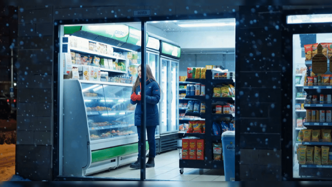 提示词:暴风雪肆虐的夜晚,便利店里温暖而宁静。年轻的女收银员穿着简单的工作服,冻得通红的双手哈着热气,认真整理着货架上的商品。冷柜的LED灯光线清冷,将冰淇淋包装纸映出不自然的青白色调。全景镜头下,可以看见店外风雪交加,与店内形成鲜明对比。