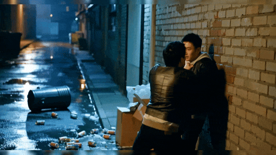 提示词:昏黄的路灯在空荡的巷口投下圆形光晕,低饱和度,画面边缘的垃圾桶翻倒在地,散落的易拉罐在积水中泛着微光。两个男子的影子被灯光拉得颀长,其中穿皮夹克的正将卫衣男子按在斑驳的砖墙上,两人正在撕扯。