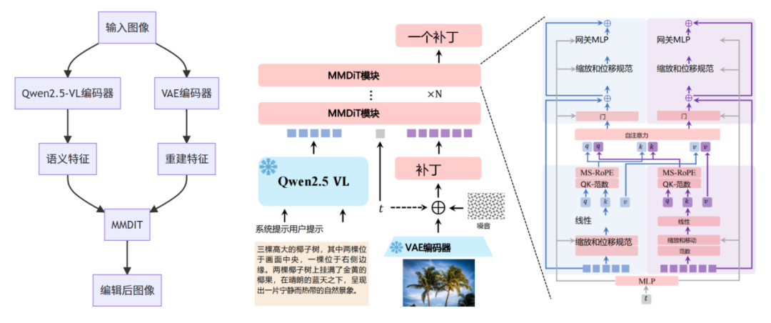 这两种信息流随后在模型内部进行融合,确保Qwen-Image-Edit在执行复杂编辑指令时,既能理解语义意图,又能保持视觉保真度。