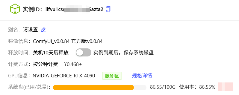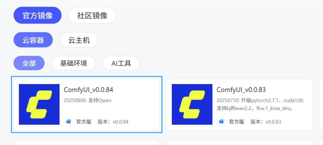 1)选择U钱包APP SERVER算力云 - 镜像中心给予的“ComfyUl_v0.0.84”快速创建实例。