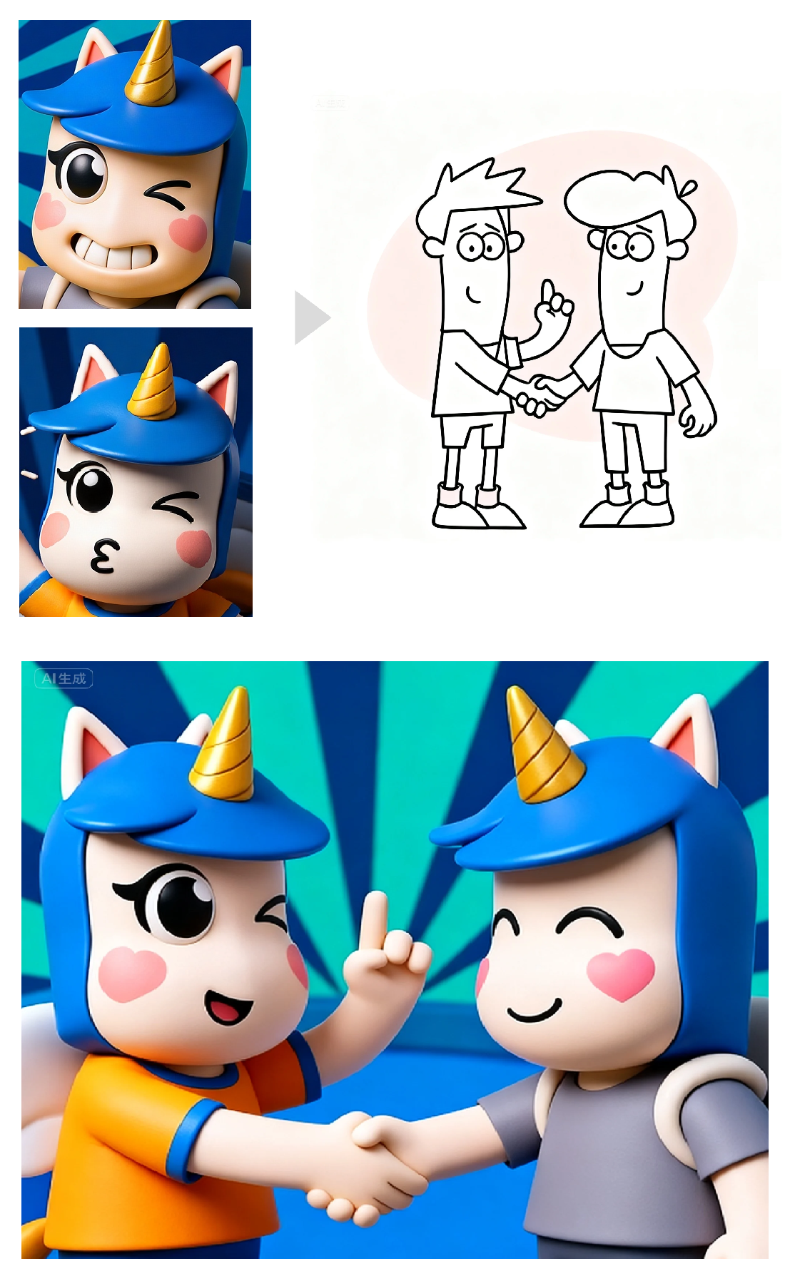 不仅如此,模型还支持对多人草图的动作进行复刻。(Seedream 4.0支持最多上传6张图,比 Nano Banana还多3张)
