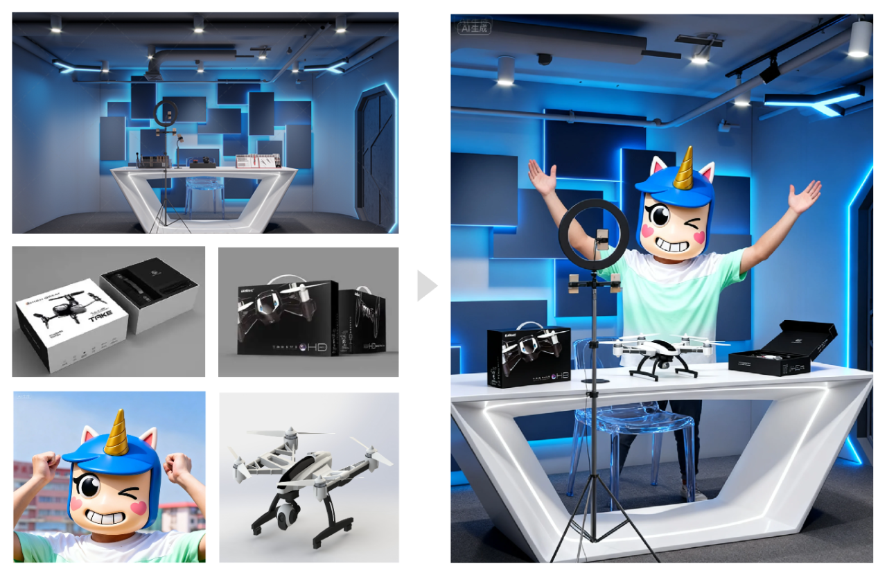 整个过程不需要复杂描述,既有审美,也有结构。实测下来,完全足够当作室内提案草图了。再看看直播场景的搭建能力,顺利获得直播间背景、无人机产品和包装图,看看 Seedream 4.0 能不能把这些碎片拼成一张完整、有氛围的带货图。