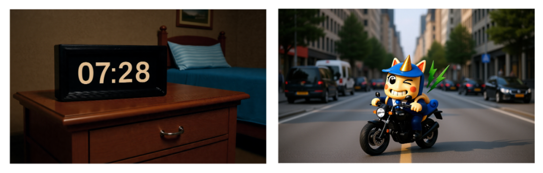 prompt:桌上的时钟显示07:28,主角背着双肩包在公路上骑着摩托车
