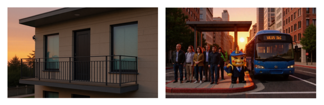 prompt:窗外已经是夕阳时分,主角在楼下和同事们一起等公交车。
