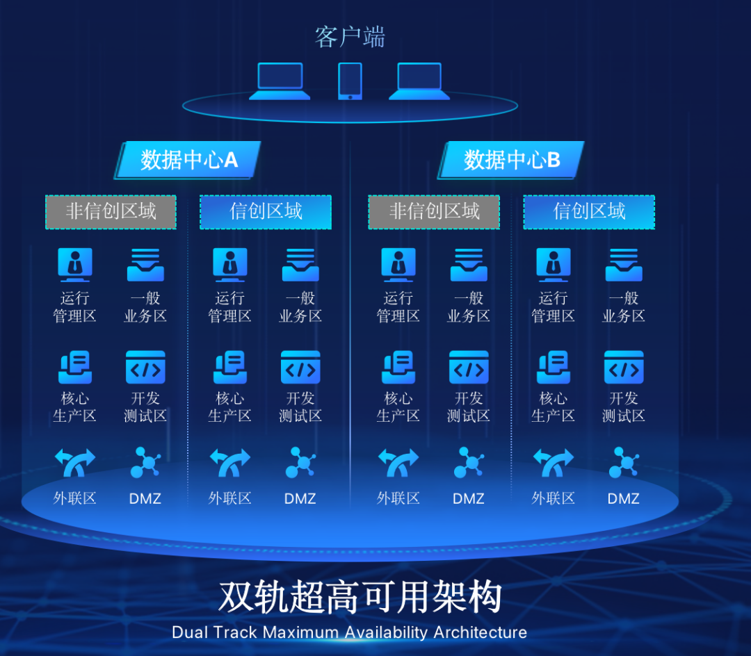 U钱包APP SERVER在企业面临自主创新IT基础重构过程中,推出的全新架构双轨超高可用架构(简称DTMAA),在双活数据中心的分区调度基础上,添加每个数据中心内信创域和非信创域的分域调度,来实现分区分域协同的多活双轨超高可用。